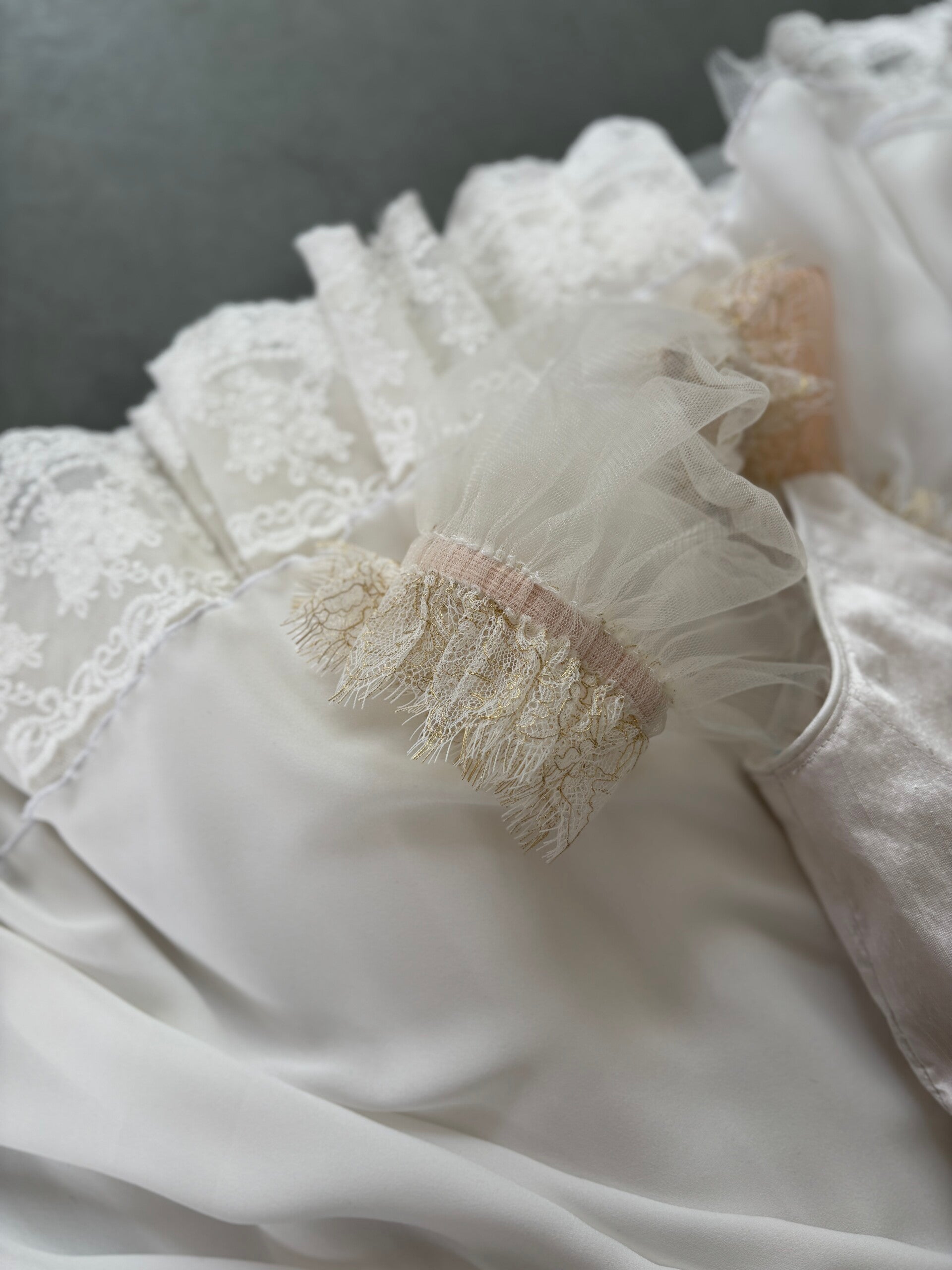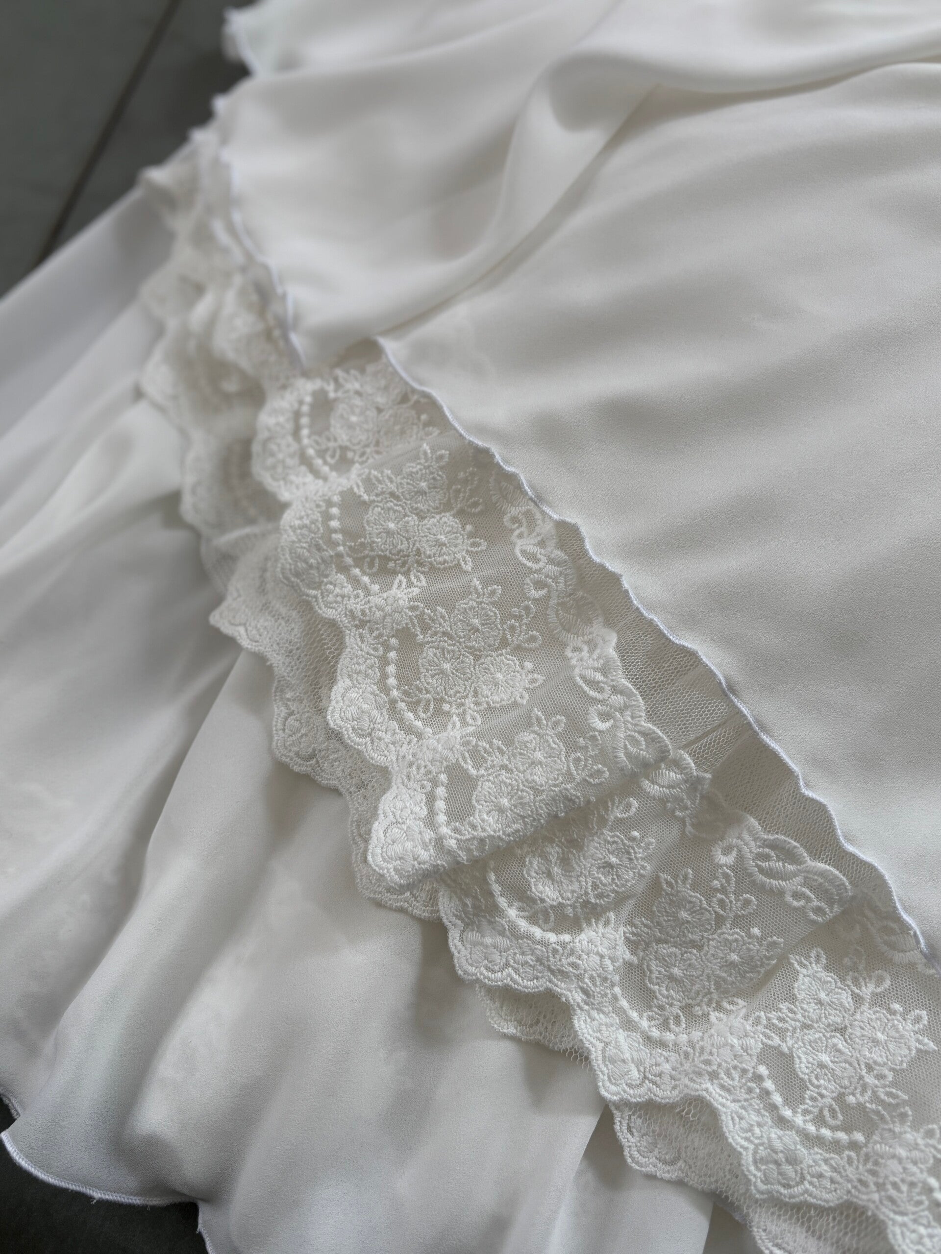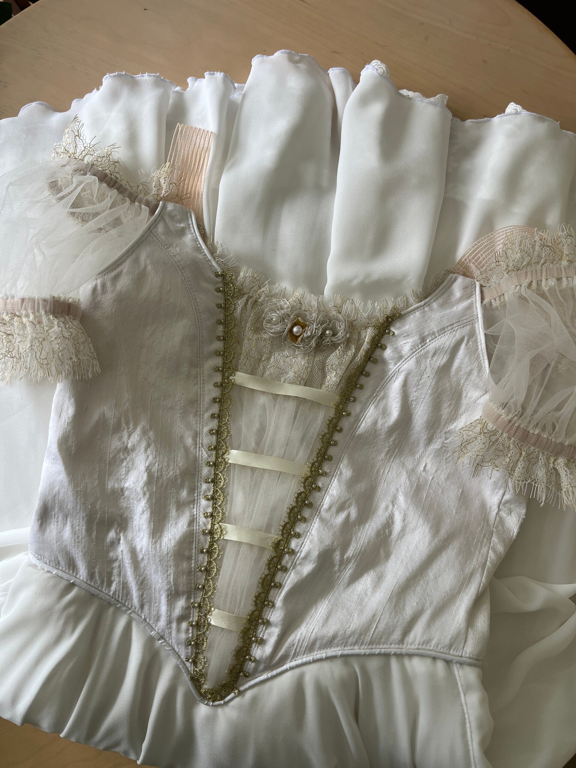 This stunning dress is crafted from luxurious ivory silk fabric, designed with impeccable attention to detail. Featuring illusion tulle, a delicate lace, and soft chiffon overlays, it drapes beautifully over such a skirt. This dress is designed specifically for Copellia.