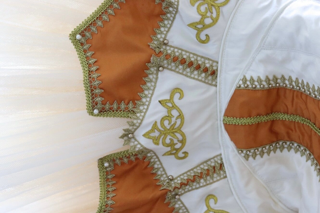 Discover the perfect blend of sophistication and charm with our unique white and mango-coloured designs, crafted using luxurious silk fabric. Another Briller original first made for a Kitri Wedding variation with a unique twist however suitable for many other variations such as Le Corsaire variations.