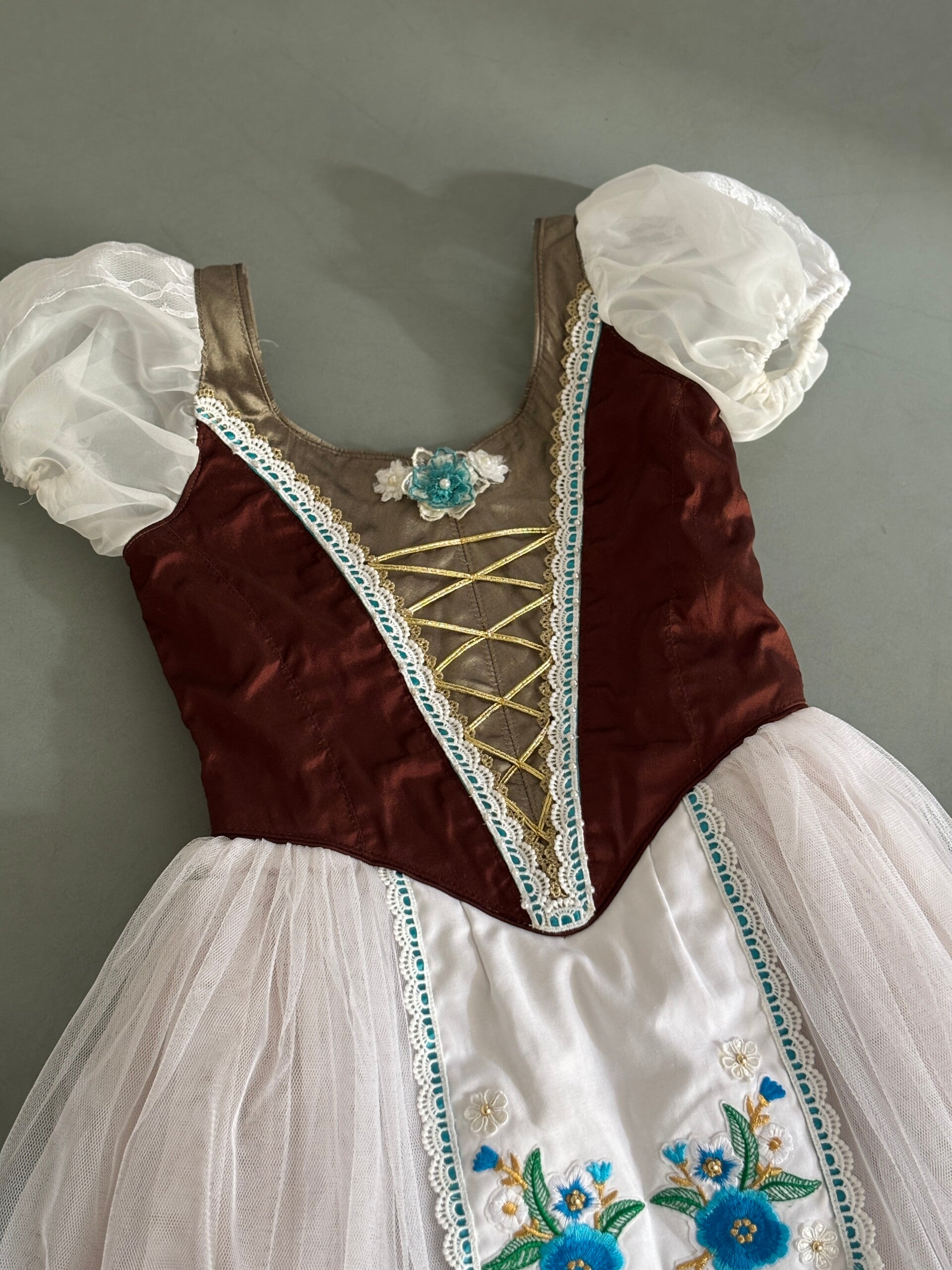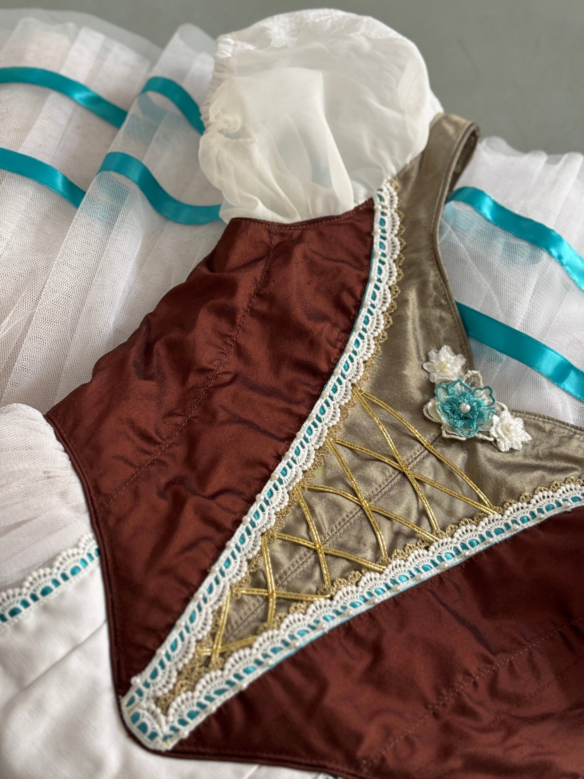 This peasant dress with a unique colour combination has a striking effect on stage where the soft tulle skirt, blue ribbon and brown and gold silk bodice make for a one of a kind costume. Designed specifically for peasant pas variations however has many other classical applications such as a demi character solo.
